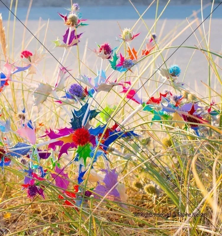 La nature est changeante, éphémère et toutes ces créations sont souvent fragiles et parfois destinées à disparaître. Cette fragilité les rend d' autant plus poétiques et émouvantes. Pour fixer dans le temps ces compositions fugitives, je me suis tournée vers un nouveau mode d'expression, la photographie. Sortant de ma zone de confort, j'ai dû apprivoiser ce nouveau média qui m'ouvre un tout nouvel univers. Ces natures mortes, comme des épis d’orge séchés, sont souvent assez rigides et ce que j'aime c'est arriver avec la peinture, la composition et la liberté que me donne la photo, à leur apporter du mouvement, du dynamisme, une tout autre dimension un peu comme une nouvelle vie, parfois loin de son état initial.